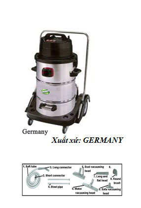 Phụ tùng kèm theo: 1 ống nhúng, 2 ống inox, 1 bàn hút bụi, 1 bàn hút nước, 1 đầu tròn, 1 đầu dẹt.